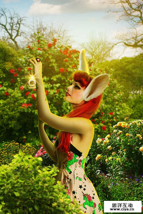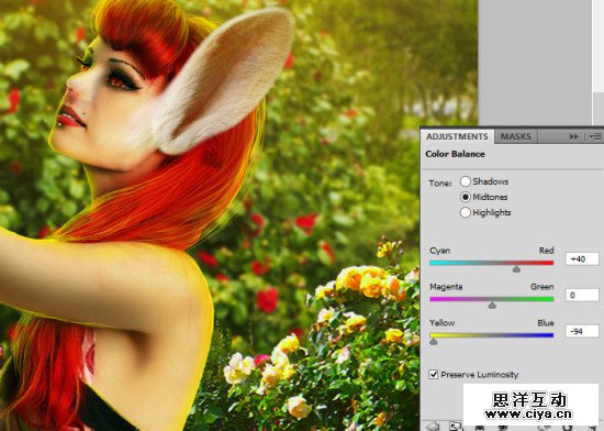 将其变形为如图所示。你将要用兔子的鼻子替换掉她自己的鼻子。通过改变图层混合模式来让两个图层更好对齐一点。