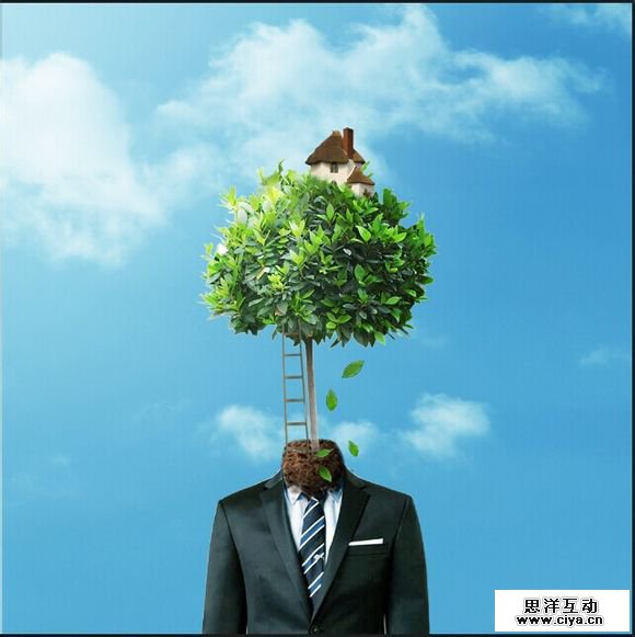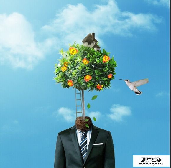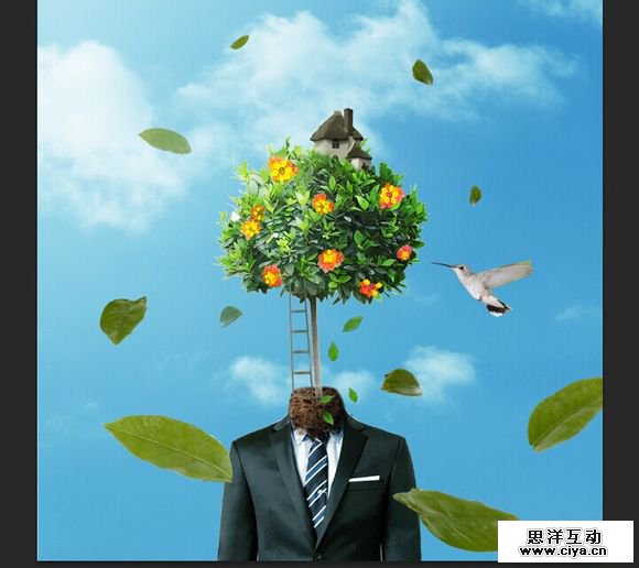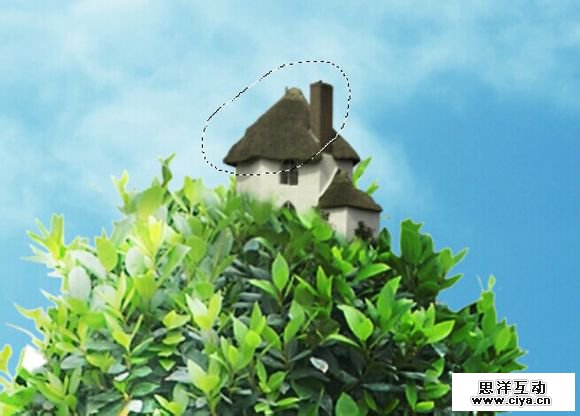 打开房子图片,抠出房子放在树顶,加蒙版擦拭。