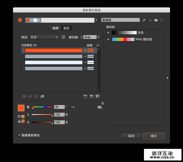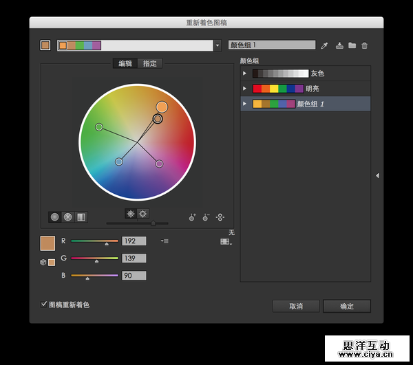 1. 用「重新着色图稿」工具,可以在一个对话框里,把作品彻底换一个主题色。如果图稿里的矢量对象越多,颜色越多,越能显现出优势。唔,就是这个工具: