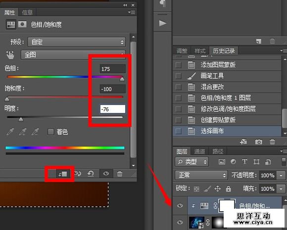 新建一个色相饱和度剪贴蒙版图层, 设置 175 -100 -76