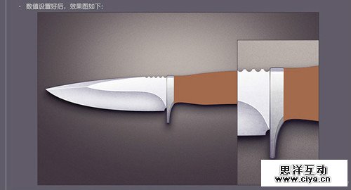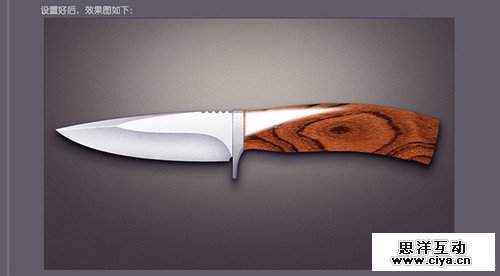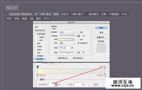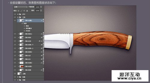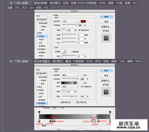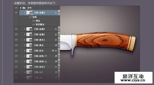 现在加强刀柄的高光,将“刀柄-高光”复制,命名为“刀柄-高光1”,混合模式:正常;不透明度:100%;样式:线性;角度:0度;缩放:100%;