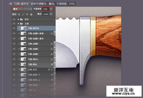 将“刀柄-细节光”的样式调整为:叠加;不透明度:25%;