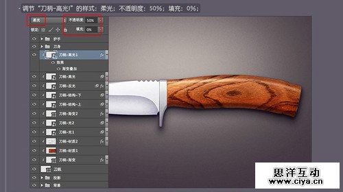 调节“刀柄-高光1”的样式:柔光;不透明度:50%;填充:0%;