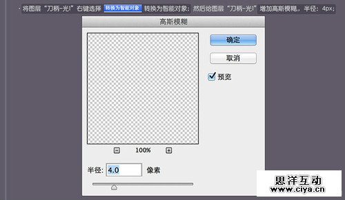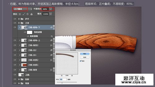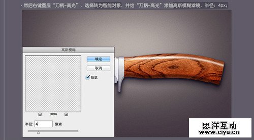然后右键图层“刀柄-高光”,选择转为智能对象,并给“刀柄-高光”添加高斯模糊滤镜,半径:4px;
