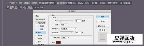 右键“刀柄-金属3-结构”创建剪切蒙版,再添加描边样式,大小:3px;位置:外部;混合模式:正片叠底;不透明度:78%;颜色:621b06;