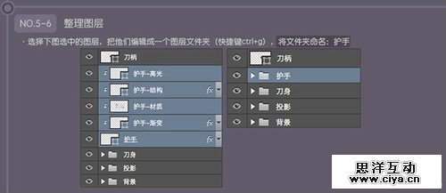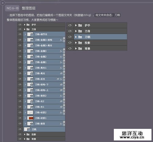 选择下图选中的图层,把他们编辑成一个图层文件夹(快捷键ctrl+g),将文件夹命名:刀柄