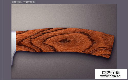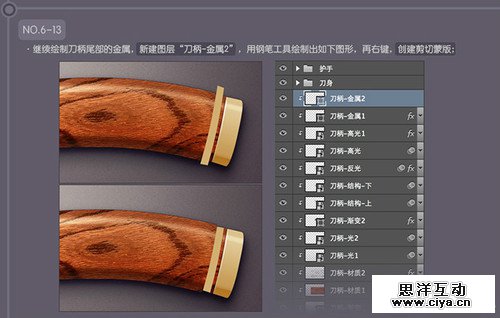 现在要加深木纹的肌理,首先复制图层“刀柄-材质1”,命名为“刀柄-材质2”,同样创建剪切蒙版;