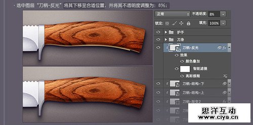 选中图层“刀柄-反光”将其下移至合适位置,并将其不透明度调整为:8%;