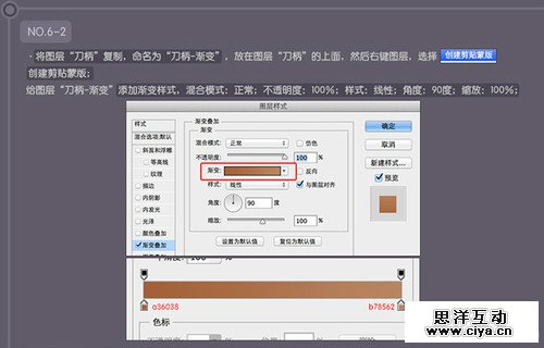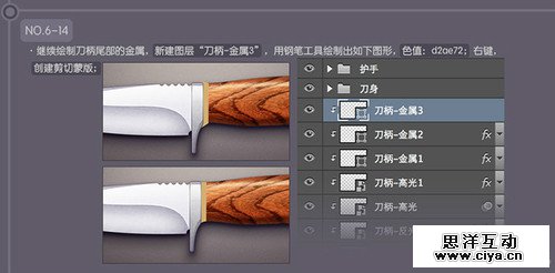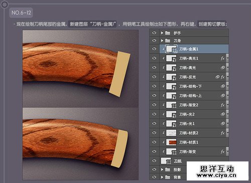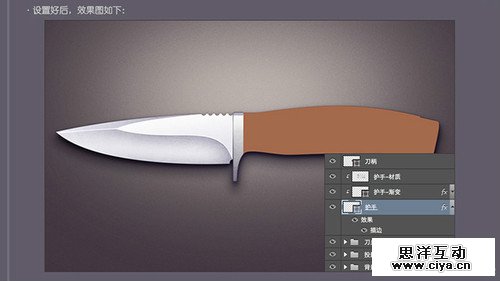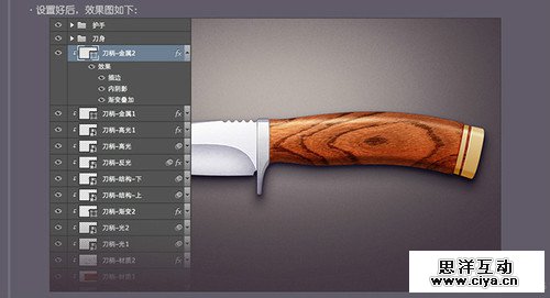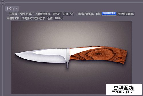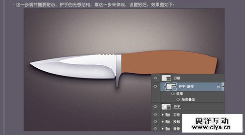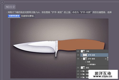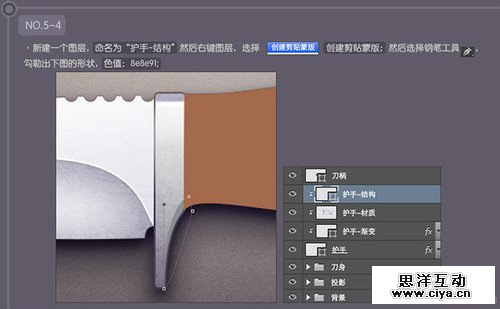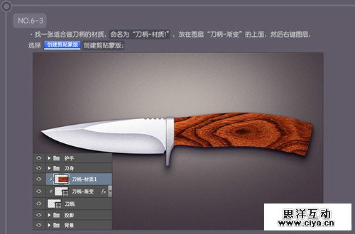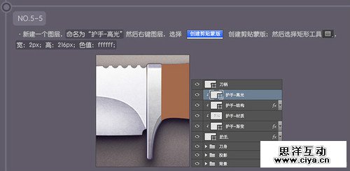 将图层“刀柄”复制,命名为“刀柄-渐变”,放在图层“刀柄”的上面,然后右键图层,创建剪贴蒙版;