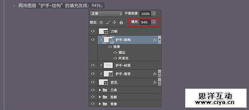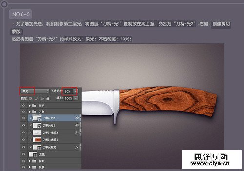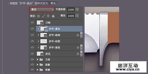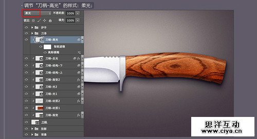 然后将图层“刀柄-光2”的样式改为:柔光;不透明度:30%;