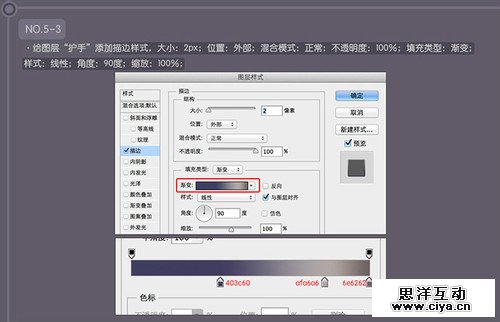 给图层“护手”添加描边样式,大小:2px;位置:外部;混合模式:正常;不透明度:100%;填充类型:渐变;样式:线性;角度:90度;缩放:100%;