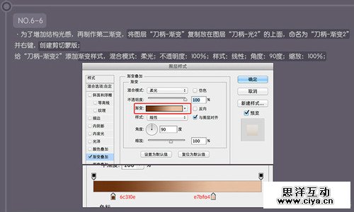 给“刀柄-渐变2”添加渐变样式,混合模式:柔光;不透明度:100%;样式:线性;角度:90度;缩放:100%;
