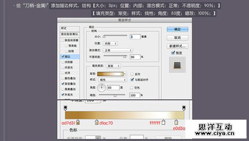 给“刀柄-金属1”添加描边样式,结构【大小:3px;位置:内部;混合模式:正常;不透明度:90%;】【 填充类型:渐变;样式:线性;角度:83度;缩放:100%;】