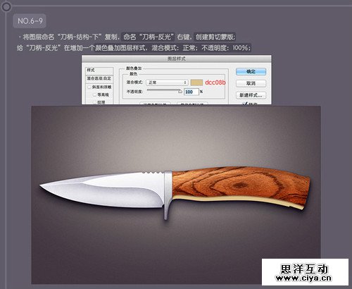 给“刀柄-反光”在增加一个颜色叠加图层样式,混合模式:正常;不透明度:100%;