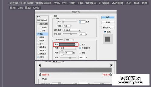给图层“护手-结构”添加描边样式,大小:2px;位置:外部;混合模式:正片叠底;不透明度:55%;样式:线性;角度:0度;缩放:100%;