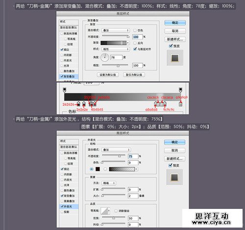 再给“刀柄-金属1”添加渐变叠加,混合模式:叠加;不透明度:100%;样式:线性;角度:78度;缩放:100%;