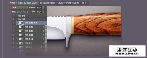 ·右键“刀柄-金属3-高光”创建剪切蒙版,再将它的样式调为:柔光;
