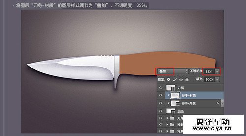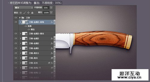 将图层“刀身-材质”的图层样式调节为“叠加”,不透明度:35%;