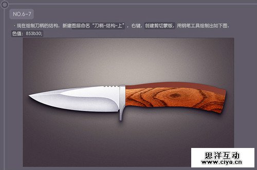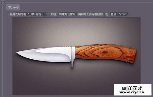 新建图层命名“刀柄-结构-下”,右键,创建剪切蒙版,用钢笔工具绘制出如下图,色值:5c3b31;