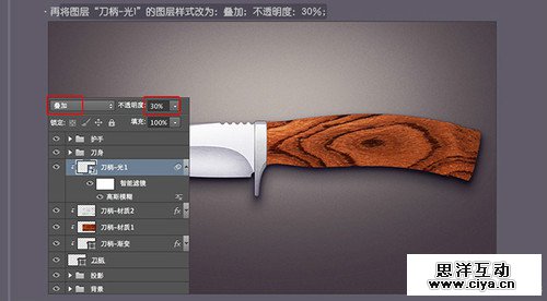 再将图层“刀柄-光1”的图层样式改为:叠加;不透明度:30%;