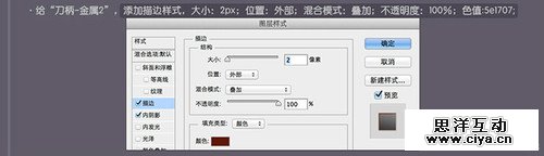 给“刀柄-金属2”,添加描边样式,大小:2px;位置:外部;混合模式:叠加;不透明度:100%;色值:5e1707;