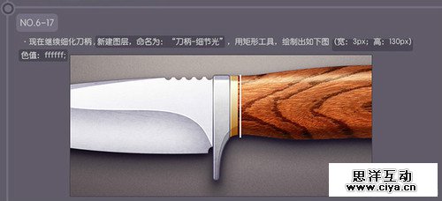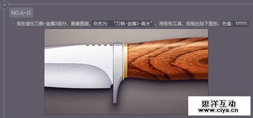 现在细化刀柄-金属3部分,新建图层,命名为:“刀柄-金属3-高光”,用矩形工具,绘制出如下图形,色值:ffffff;