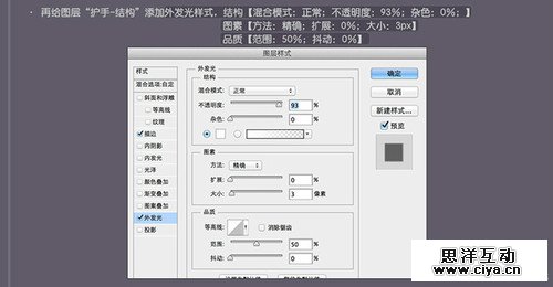 再给图层“护手-结构”添加外发光样式,结构【混合模式:正常;不透明度:93%;杂色:0%;】图素【方法:精确;扩展:0%;大小:3px】品质【范围:50%;抖动:0%】