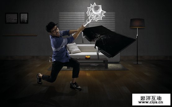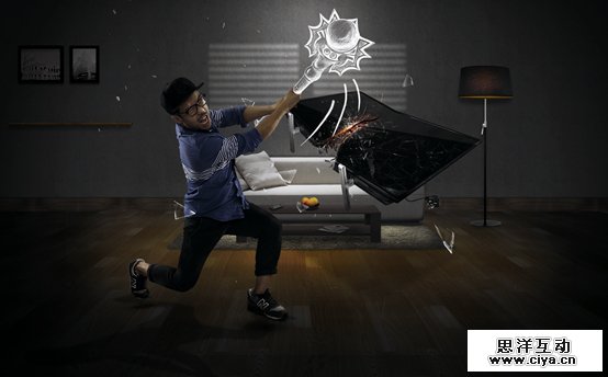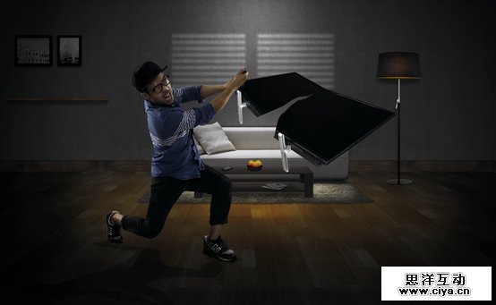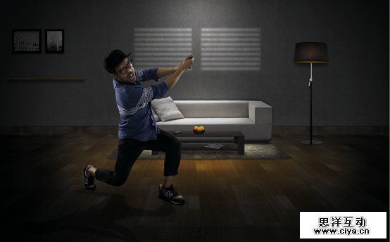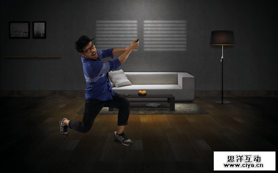 三组照片,不同动作。用夸张的表现形式强调体感操作的特点。隐喻我们的游戏画面很好很逼真,很容易让人身临其境,告诉玩家玩游戏时候不要太入戏,小心你的电视屏幕。