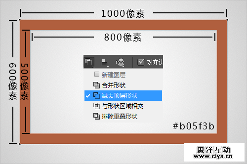 设置前景色为# b05f3b,使用矩形工具,画一个1000*600像素的矩形,再画一个900*500的矩形,使用减去顶层形状模式,交将其命名为“木框轮廓”。