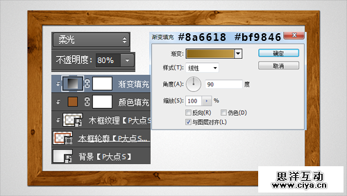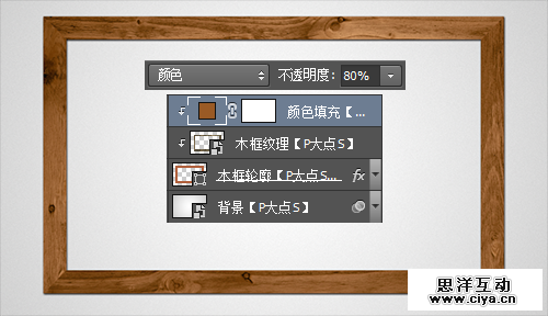 我们可以看到,现在木纹的颜色灰色太重,不是很漂亮,我们修改一下。将“木框纹理”图层组转换为智能对象,创建剪贴蒙版。在其上层,添加一个#9a5a25 颜色的“纯色”调整层,将图层混合模式更改为“颜色”,不透明度“80%”,并创建剪贴蒙版。