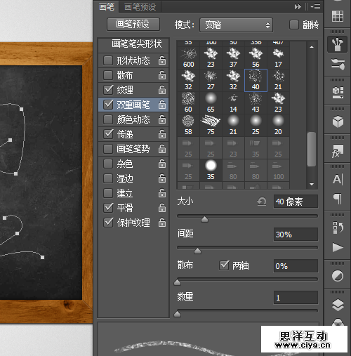 勾选“双重画笔”,选择PS自带的sampled tip 40像素画笔。参数如下图。