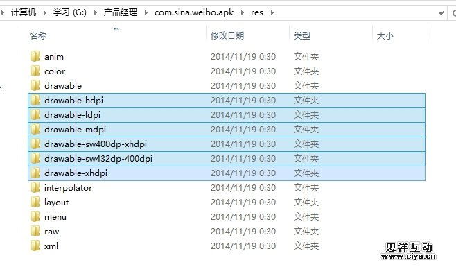 资源文件安静地躺在res文件夹下,以“drawable-*dpi”命名的就是图片素材。其中,ldpi –> mdpi –> hdpi –> xhdpi –> xxhdpi表示适配分辨率依次增大,目前的应用一般在hdpi和最大的一个里图片最多,可根据实际需求来选择自己要的。