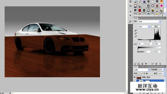 把地板的透明度调回来,然后我把它的图层模式改为“正片叠底”,这样汽车底部的阴影和倒影能显示出来,不过还是太弱,继续用色阶把倒影和阴影部分加强一下。