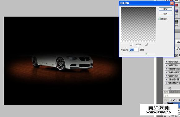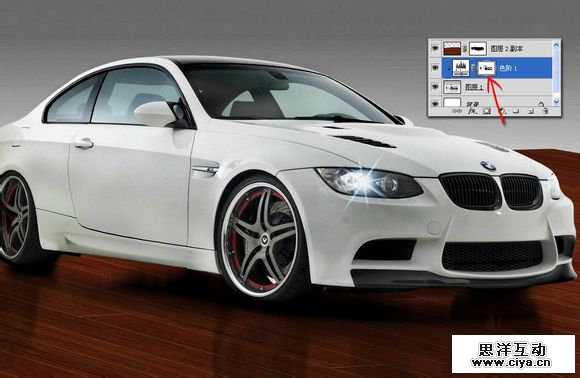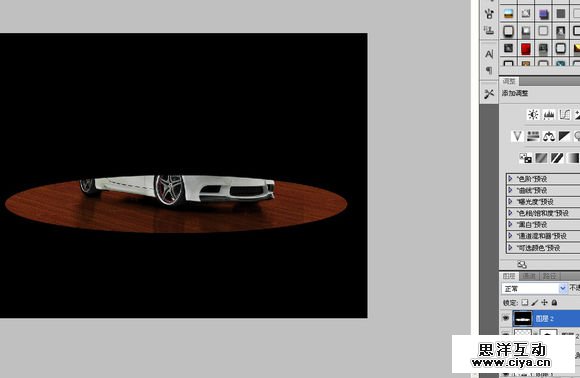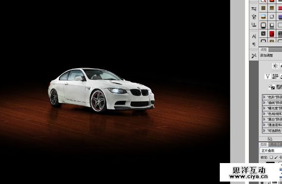 这样感觉好多了,然后用钢笔抠出汽车,添加地板的蒙版。现在汽车终于停在地板上了。