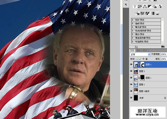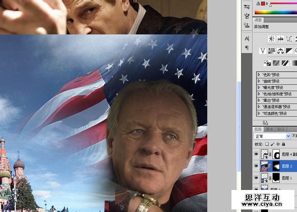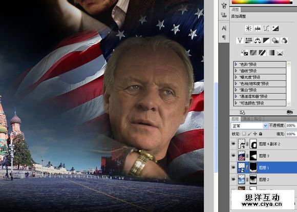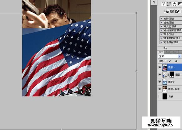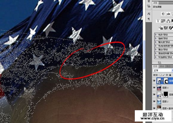 给星条旗也加一个蒙版,让它融入红场和天空。