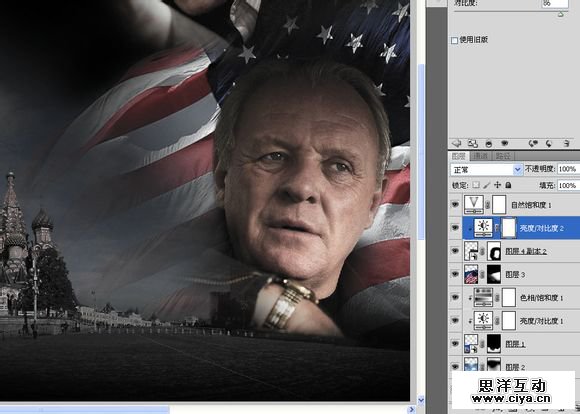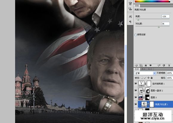 给红场剪贴蒙版一个“亮度对比度”调整层,让红场也暗下来。