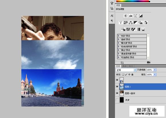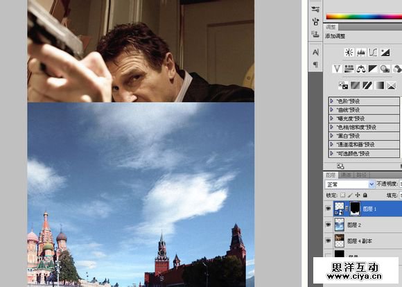 这个天空有点假,有这么蓝的天?为了照顾到生活在天朝的吧友心情,我必须把天空的颜色弄得更贴近我们真实的生活环境,我找到一张没那么假,又有些白云的天空,把它安排在红场的下面层。