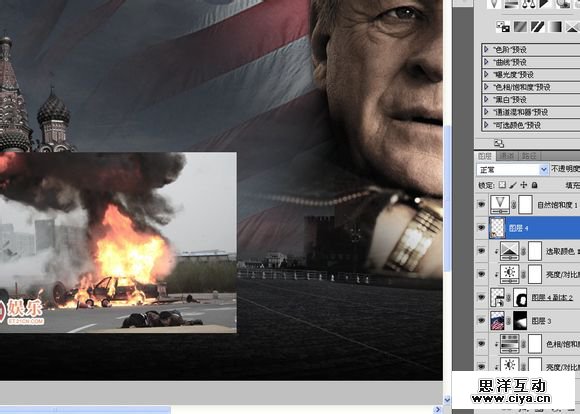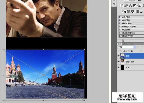所有的素材都定位完毕之后,我要做一些颜色上的微调,在红场的蒙版上边涂几笔,让底部暗一些。
