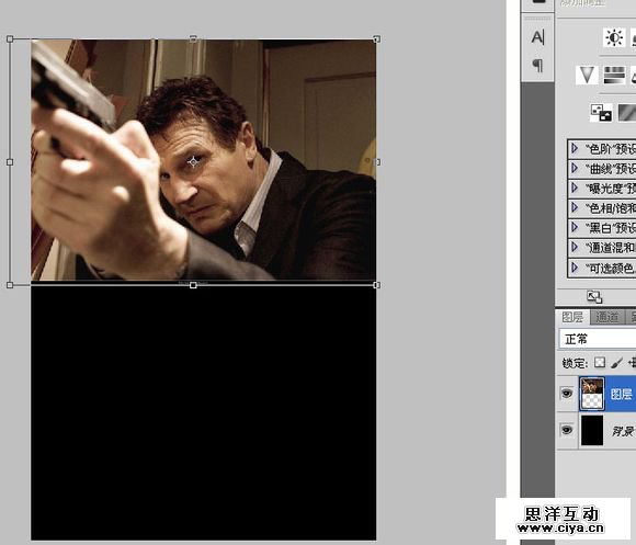 先建一张1600*1100,72分辨率的黑色背景,拖入一张尼姆连森在《飓风营救》中的剧照裁图,调整一下大小及位置这是一部很不错的片子。