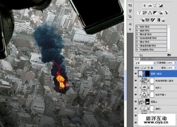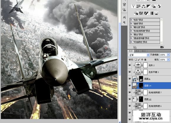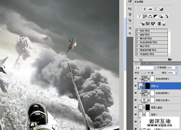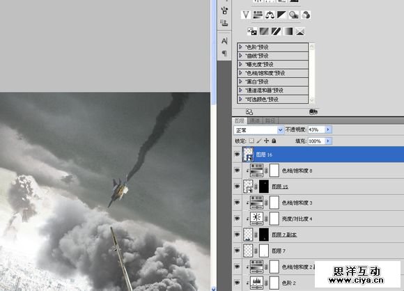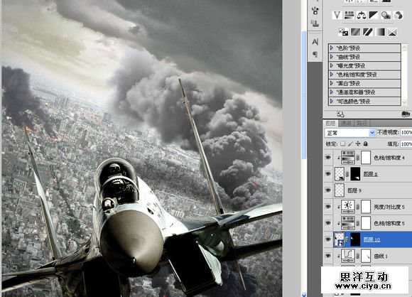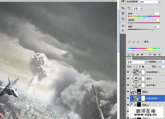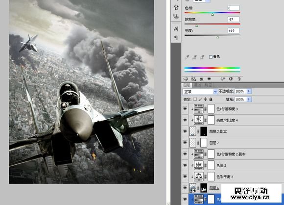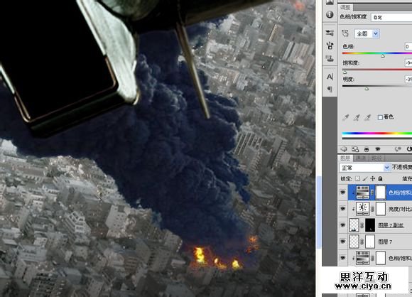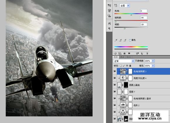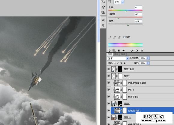 复制到“空战”,横向翻转一下,重新调整大小及角度。添加一个饱和度,调低饱和度的同时提高亮度,模拟原子弹爆炸时的强光。