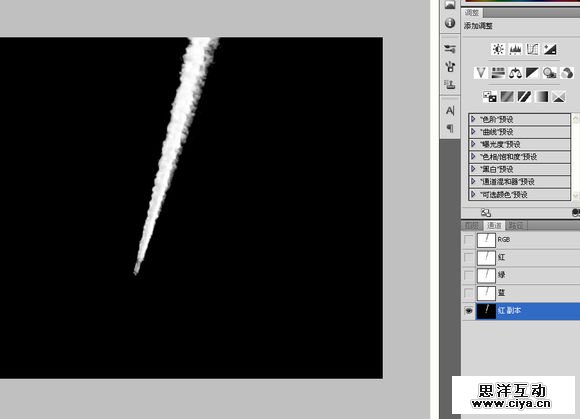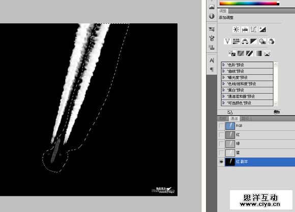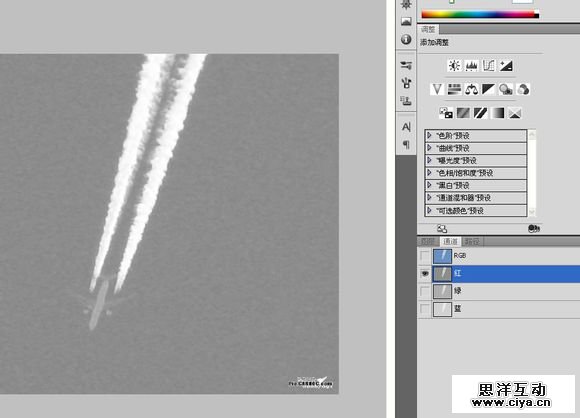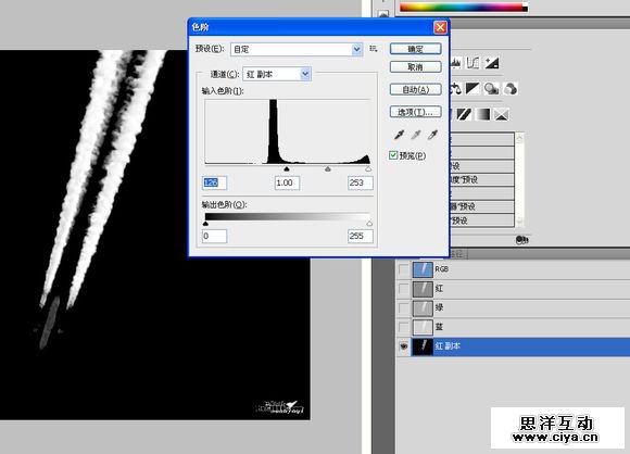 当然还要在通道处理,对比一下各个通道。最后我选择了红色通道。色阶调整一下,CTRL+鼠标左键取得选区在图层里添加蒙版。