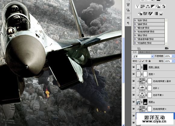 复制到“空战”,安排到右上角位置,减低色相饱和度。