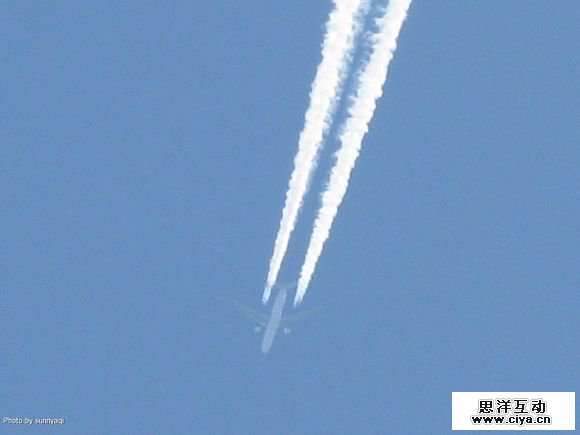 当飞机被击中坠落时会随着一条浓烟翻滚而下,我找了一张喷气机飞过出现的白烟图片。