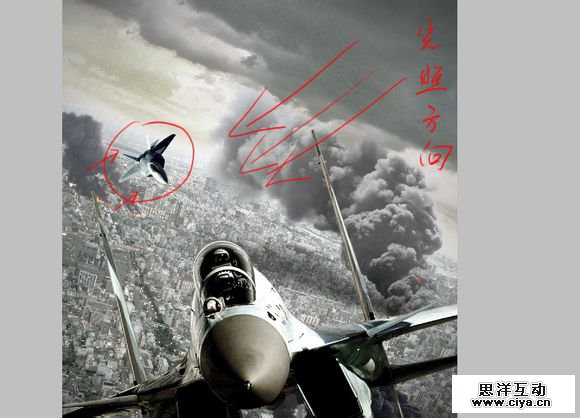 我特意画了一张示意图来强调细节的重要性,如果我一成不变的使用这架F22显然大大的穿帮了,整个画面的光照方向来自右边,而这架F22的受光面却在左边,显然不科学,所以需要水平翻转一下才对。