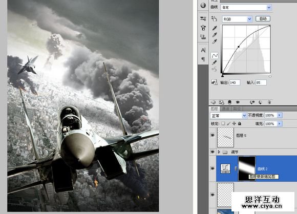 当原子弹爆炸是发出的强光会照亮整个地平线,所以我再背景层上再追加一个曲线,提高亮度,使用模板限制它的发光范围,让发光只局限在地平线一带。我把缩略图调大让大家看的更清楚些。