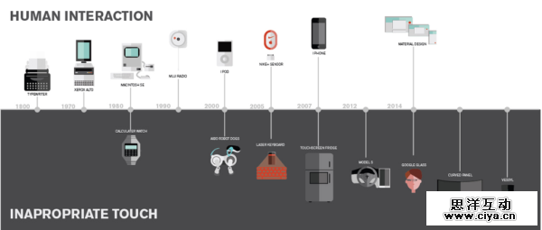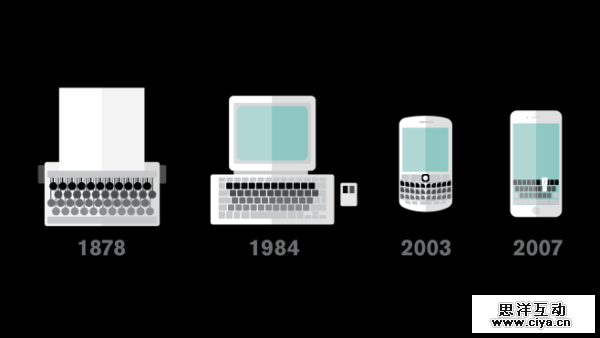 从 1878 年生产的雷明顿 2 号打字机到 1984 年第一代苹果 Macintosh 个人计算机再到 2003 年的黑莓推出的全键盘智能手机再到 2007 年苹果第一代 iPhone 智能手机的虚拟键盘。