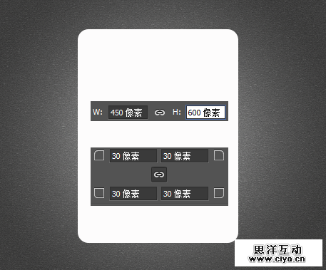 使用圆角矩形工具画一个450*600的圆角矩形,设置圆角为30度,居中对齐。
