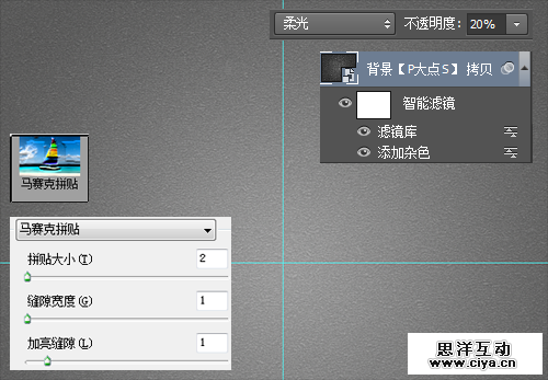 复制一层背景图层,执行“滤镜—滤镜库—纹理—马赛克拼贴”,设置拼贴大小为2,缝隙宽度为1 ,加亮缝隙为1,并将这个图层的图层混合模式更改为“柔光”,不透明度20%。