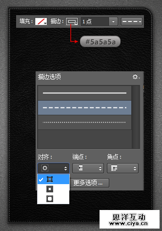 使用直接选择工具,选择住形状,在形状选项菜单中,设置形状填充颜色为无,形状描边1像素,描边颜色为#5a5a5a,虚线描边。 具体设置请看下图: