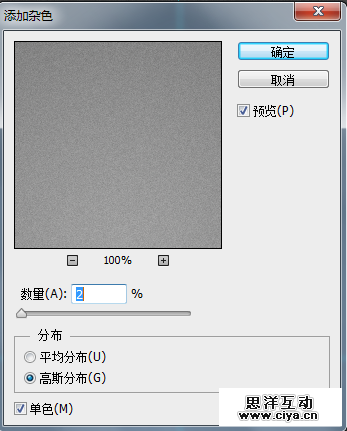 添加一个杂色,设置杂色数量为2%,高斯分布,勾选单色。